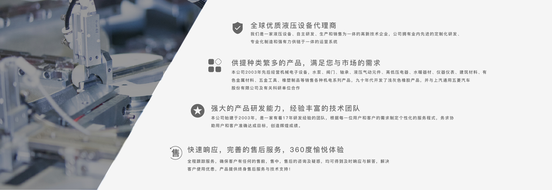 • 柳州航海液壓機電設備有限公司成立于2003年,是一家集商貿、設計、生產制造和銷售于一體的綜合性企業,專業從事各類液壓缸,液壓系統和膠管總成的研發和生產,代理銷售國內外知名品牌的液壓氣動元件,閥門電氣,自動化設備,工業設備配件等產品。產品廣泛應用于冶金,機床,汽車,港口,化工,工程機械等領域。公司始終堅持“誠信為本,合作共贏,服務至上,質量最優”的經營理念,歷經近二十年的發展,積累了眾多客戶和出色的口碑,成為行業內領先的設備供應商,服務于柳鋼集團,柳工,上汽通用五菱,廣西盛隆冶金,柳州銀海鋁業,南南鋁業等眾多知名企業。公司將不斷提升核心競爭力,致力于為客戶提供高效、優質的液壓產品和相關技術解決方案。